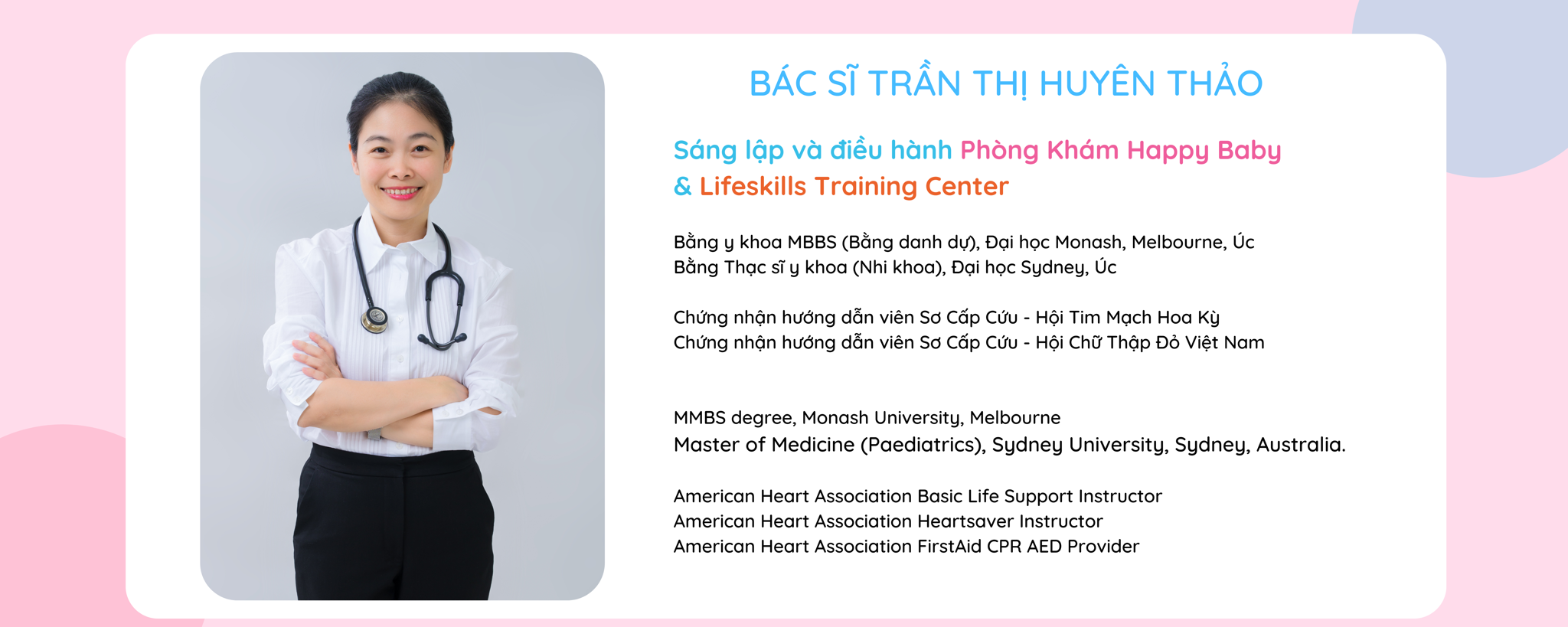 Bác sĩ Nhi Khoa, sáng lập và điều hành chuỗi phòng khám Happy Baby. Bác sĩ cũng là tác giả của bộ sách chăm sóc trẻ em “Bác sĩ riêng của bé yêu” bao gồm